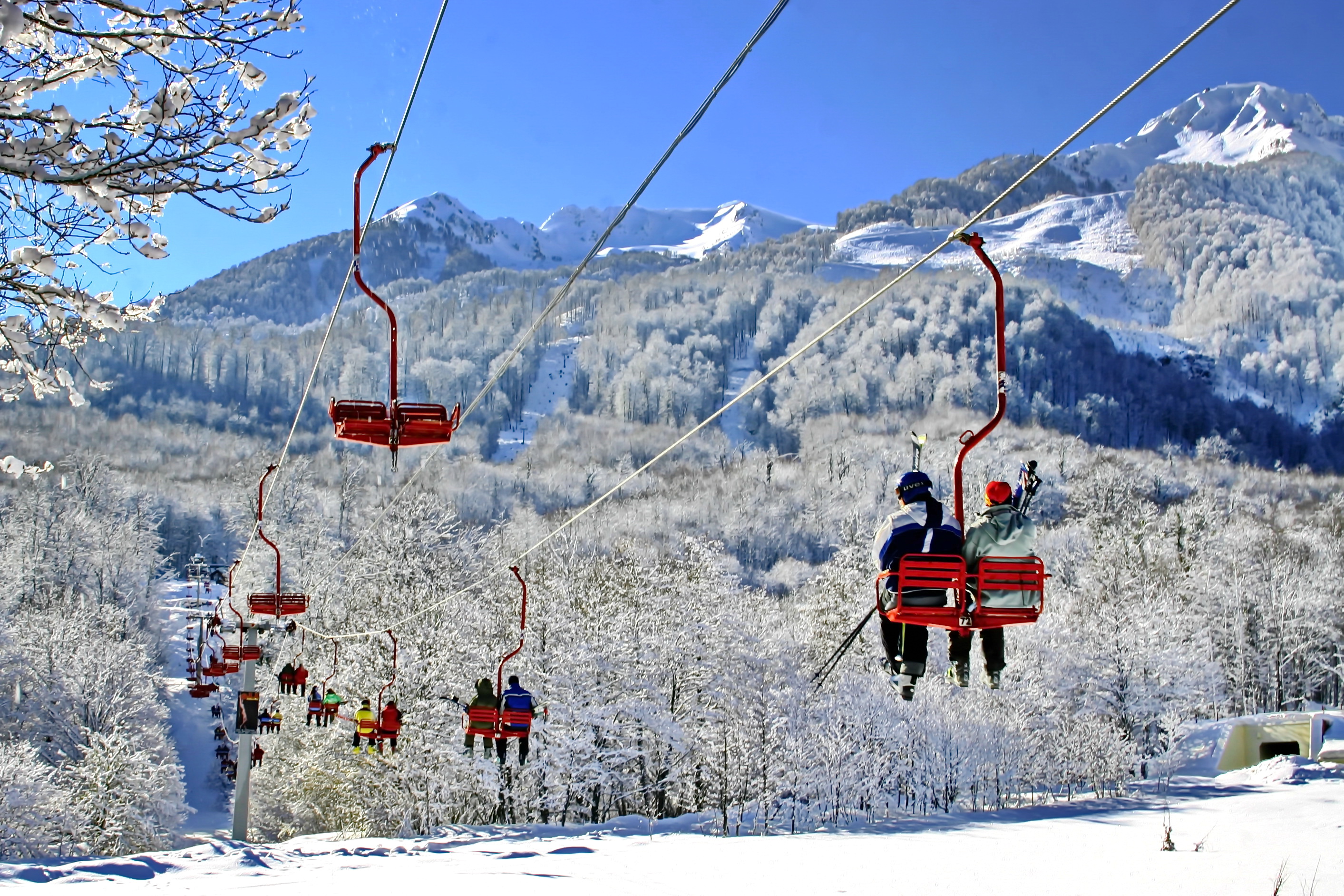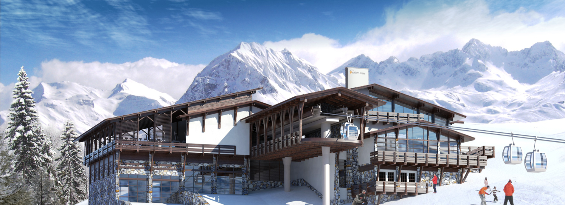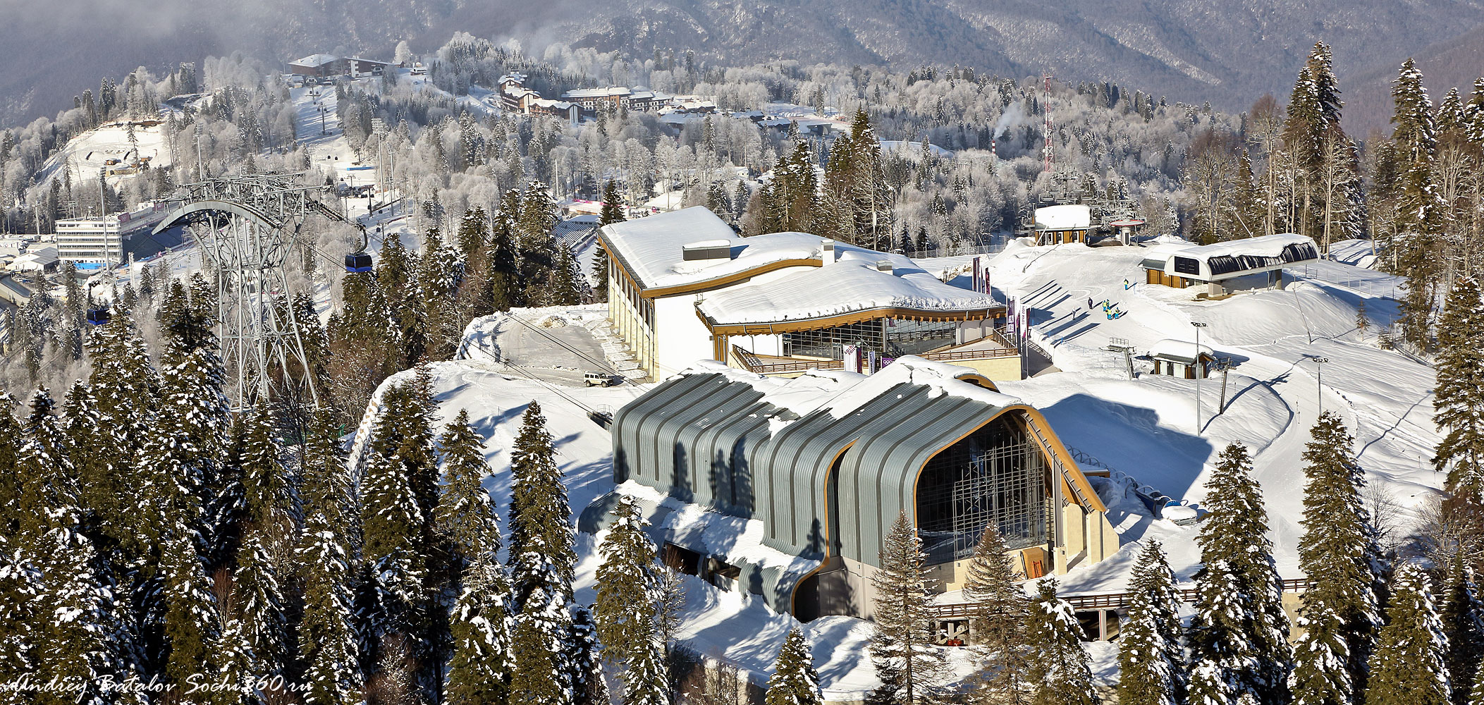 Станция канатных дорог горно-туристического центра "Газпром", где вы сможете купить ски-пассы и взять инвентарь в прокате SKICLUB